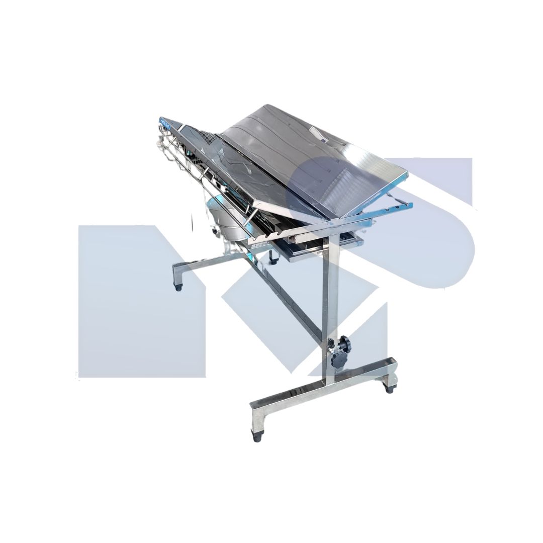 Mesa cirúrgica com tampo calha, totalmente em aço inox 304.